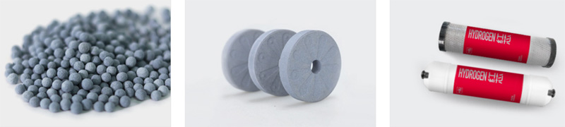 图2 矿物制氢颗粒、制氢瓷片、陶瓷膜制氢滤芯 矿物制氢材料的制氢原理 矿物制氢材料是通过与水反应制氢。其中,镁基矿物制氢材料的原理是利用镁与水发生水解反应制取氢气,硅基矿物制氢材料的原理是利用纳米硅与水发生反应制氢。 反应方程式为:Mg+2H2O=Mg(OH)2+H2↑。 反应方程式为:Si+2H2O=SiO2(H2SiO3)+2H2↑。 镁基矿物制氢材料的反应产物为氢氧化镁和氢气,氢氧化镁被包覆在矿物复合材料内不会溶出,只有产生的氢气通过矿物制氢材料的微纳米通道释放出来。 硅基制氢材料的反应产物为偏硅酸/二氧化硅和氢气,偏硅酸在水中不稳定易变成二氧化硅且被包覆在矿物材料内。 为何要将金属/非金属制氢材料与矿物材料复合? 首先是安全问题,镁基材料有易燃性,将其与矿物材料复合具有较强的惰性,安全性得到保障。再就是与矿物材料复合后可提供催化反应的微电解环境,更有利于提高制氢效率和可控释氢。还有就是矿物复合制氢材料水解制氢的同时,可溶出丰富的矿物质元素,提高氢水的PH值,更有利于水质的改善。 目前,上市销售的矿物制氢材料主要有镁基和硅基两种,产品形态有制氢颗粒、瓷片和陶瓷膜制氢滤芯三种。 在矿物制氢材料的研制方面,木齐科技走在了前列,也是制氢产品种类比较全的生产厂家。制氢颗粒有镁基和硅基,其适用水温范围宽,水温越高制氢越快。主要应用于富氢杯壶、氢水机、氢农业和氢美容等产品。制氢瓷片型有镁基和硅基,因其采用压制工艺制成,常温水反应较慢,更适用开水/热水制氢,水温越高制氢越快。主要应用于富氢杯壶、氢美容等产品。陶瓷膜制氢滤芯是新开发的矿物制氢产品,采用压滤式水解制氢原理,具有制氢效率高、水质干净无粉尘等特点,可适用冷热水。陶瓷膜制氢滤芯主要应用于氢水机和氢农业等领域。 矿物制氢材料所制氢水除了含氢外,还有什么功能特点? 矿物制氢材料水解制氢成的富氢水具有五种功能特点,分别是富含氢、负电位、弱碱性、小分子团和富含矿物质。 所制的氢水含氢浓度可达1500ppb以上,负电位(ORP)达到-200mv以下。负电位是指水的氧化还原电位(ORP),是用来衡量水的氧化性和还原性的指标。正常饮用水的氧化还原电位值在正的100mv左右,而矿物制氢材料制造的氢水氧化还原电位(ORP)为-200至-500mv,具有较强的还原性。饮用负电位会不仅可缓解运动后的肌肉酸痛,对抗疲劳也有效果。 矿物制氢材料制成的富氢水弱碱性在8-8.5之间,若浸泡时间长则会达到9-9.5。水分子团O17半峰宽可达到45Hz。水分子团大小一般采用O17的半峰宽来判断,半峰宽越大说明水分子团越大,越小说明水分子团越小。正常饮用水的O17的半峰宽为80Hz以上,而矿物制氢材料经复旦大学分析测试中心检测O17的半峰宽为45Hz,是比较好的小分子团水。 矿物制氢材料是根据德国诺尔登瑙洞窟泉水的制氢原理,模拟洞窟岩壁矿物成分,在水中浸泡或水流经时会溶出微量元素,主要有镁、锌、钙、偏硅酸等微量元素,这些矿物质可提高水的碱性,降低水的氧化还原电位值。