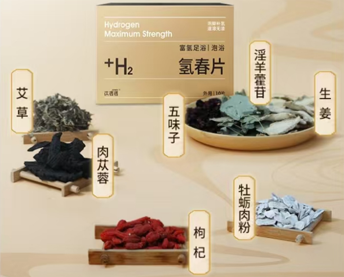 一、氢春片:融合科技与传统的养生瑰宝 氢春片是一款独特的足浴氢气片,它将中草药提取物精华与固态氢完美融合,经过特殊工艺精心制作而成。氢春片应用泡腾崩解制氢技术,当氢春片遇水时,会释放出氢气和中草药精华,两者协同增效。既有氢气的抗氧化和抗炎症效果,又能促进药效的透皮吸收,给我们带来全新的泡脚养生新体验。无论是泡脚还是泡澡,氢春片都能发挥其神奇的功效。 二、足底穴位与肾气提升 我们都知道,足底具有丰富的穴位,其中涌泉穴更是肾经的第一穴。通过热水泡脚补氢,氢气可以通过足底穴位,特别是涌泉穴透皮吸收升腾入肾经,进而贯通全身,特别是能补充身体下肢的氢气。这种独特的方式能够有效地提升肾气,增强身体动力,从而改善我们的健康状况。泡脚补氢可以拟补鼻吸氢和饮用富氢水带来的问题,可与吸氢和饮用富氢水互为补充。 三、氢春片的三大特色 1、速溶无渣:氢春片采用中草药提取物精华配制,并且应用了先进的泡腾崩解释氢技术。这使得氢春片在遇水时能够迅速溶解,且不会留下任何残渣。使用起来非常方便,让您无需担心残留物质带来的不便和对身体的影响。 2、泡脚补氢:氢春片遇水释放的氢气,能够精准地通过足底穴位被人体吸收。尤其是通过肾经第一穴涌泉,氢气可以迅速升腾入肾经,实现高效的补氢效果。让我们在享受泡脚的舒适同时,为身体注入满满的元气。 3、补阳扶正:氢气与中草药的完美结合,产生了协同增效的作用。透皮吸 氢的方式,使得氢春片能够起到补阳扶正的显著效果。帮助您增强体质,抵御疾病的侵袭。 四、千年经方,科学配比 氢春片的中药配方源自千年经方,且经过专家的科学配比而成。主要成分包括淫羊藿苷、肉苁蓉、牡蛎肉粉、五味子、枸杞、艾草、生姜等。这些珍贵的中草药成分相互搭配,具有阴阳平衡、阴阳双补的神奇效果。能够从根本上调理身体,提升肾气,让您重焕生机。