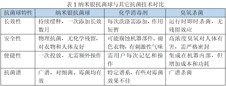 二、纳米银抗菌球在洗衣机中的针对性应用与痛点解决 洗衣机,特别是滚筒洗衣机的门封胶圈、内筒底部、排水泵等部位,常年处于潮湿环境,是霉菌(如曲霉、青霉)和细菌(如大肠杆菌、金黄色葡萄球菌)滋生的温床。 2.1 洗衣机微生物污染的深层影响 •异味源头:微生物代谢产生的挥发性有机物是衣物异味的根本原因。 •二次污染:看似干净的洗衣机,实际可能成为“污染源”,洗涤过程中细菌和霉菌孢子会附着在衣物上,尤其是贴身衣物,可能引发皮肤过敏、交叉感染等问题。 •机器性能衰减:菌膜和污垢的积聚可能影响水位传感器、排水阀等部件的正常工作。 2.2 纳米银抗菌球的集成解决方案与优势对比 与传统化学消毒剂(如含氯漂白剂)或臭氧杀菌相比,纳米银抗菌球方案具备显著优势。
