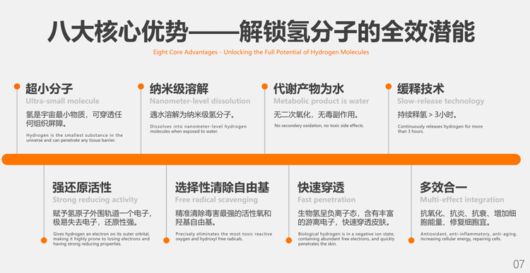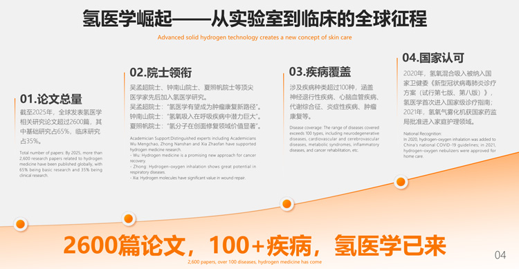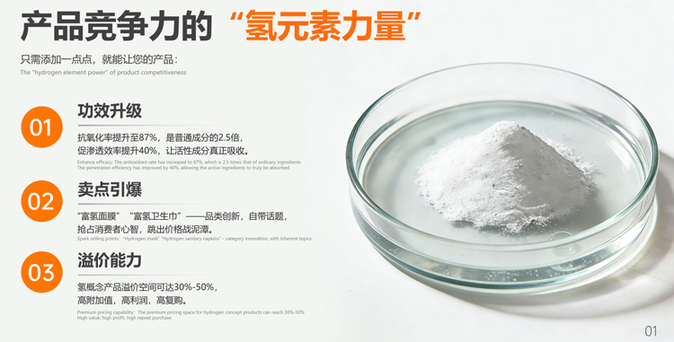 4.3 医疗领域:严肃医学的潜力股 这是技术要求最高、但也是价值最大的方向。镁离子与氢气的双重医学价值,为医疗级应用提供了科学基础。 4.3.1 现有布局 医美术后修复:利用氢的抗炎、抗氧化特性,开发用于激光术后修复、促进创面愈合的医用敷料。 私密护理:富氢卫生巾可进一步向医用级私处护理产品延伸。 运动恢复:为运动人群定制氢舒缓喷雾、氢敷贴,助力缓解肌肉酸痛。 4.3.2 未来方向 “氢中药”创新:将现代氢分子医学与传统中医药结合,探索复合型健康解决方案。 疾病辅助治疗:联合医疗机构,针对糖尿病、阿尔茨海默病等开展临床研究。 吸入式医疗:基于固态氢的便携式吸入装置,满足家庭医疗需求。